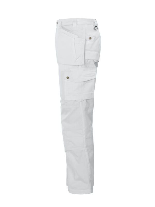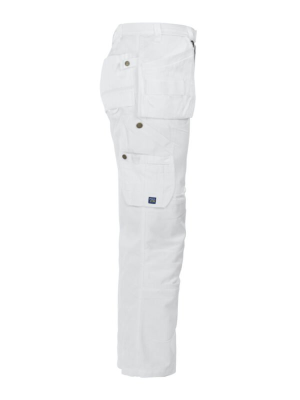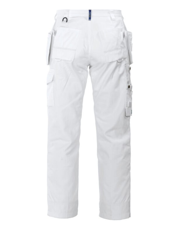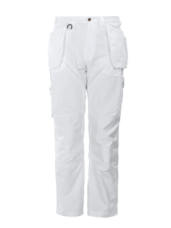 To hengende spikerlommer som kan puttes bort. Ekstra lommer hvorav en er med verktøyshemper. Spikerlommene er forsterket med 100% Cordura®. Dype sidelommer med plass til hengelommene. To D-ringer. To regulerbare hammerhanker. Benlommer med plass til telefon, penn- og verktøy. Tommestokklomme med verktøyslomme og knivknapp. Knebeskyttelseslommer i Cordura®, åpning fra innsiden og regulerbar høyde av knebeskyttelsene. Forbøyde knær. Forsterket nederst på baksiden av buksen med Cordura®. Romslige baklommer. Baklommer med benlommer har hemper for Inbags.