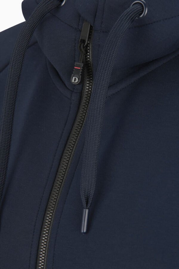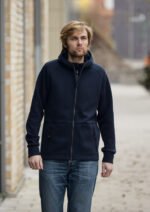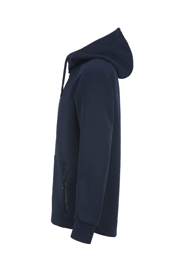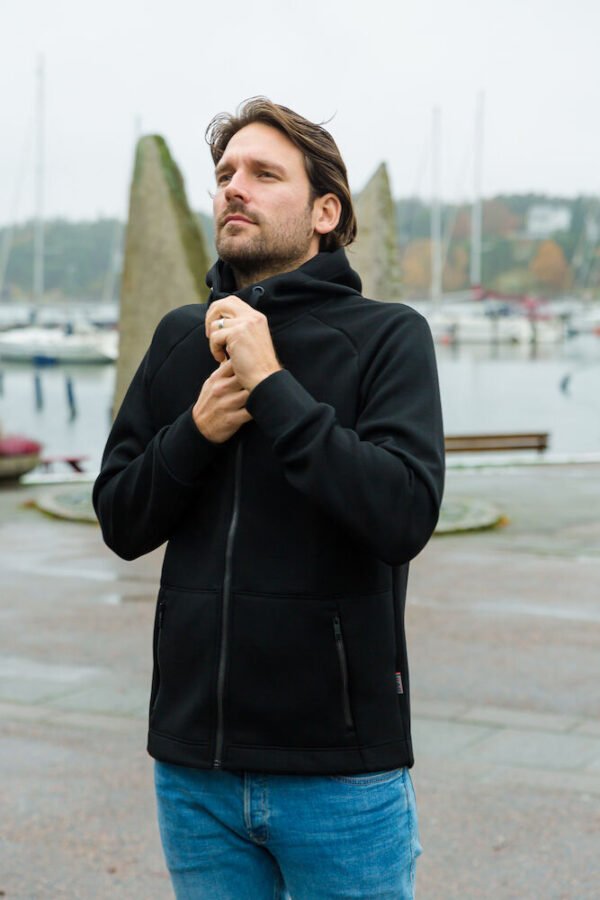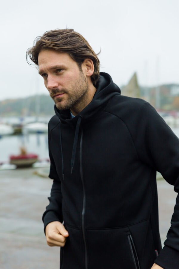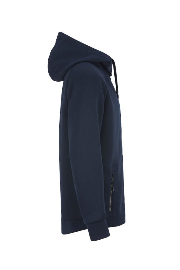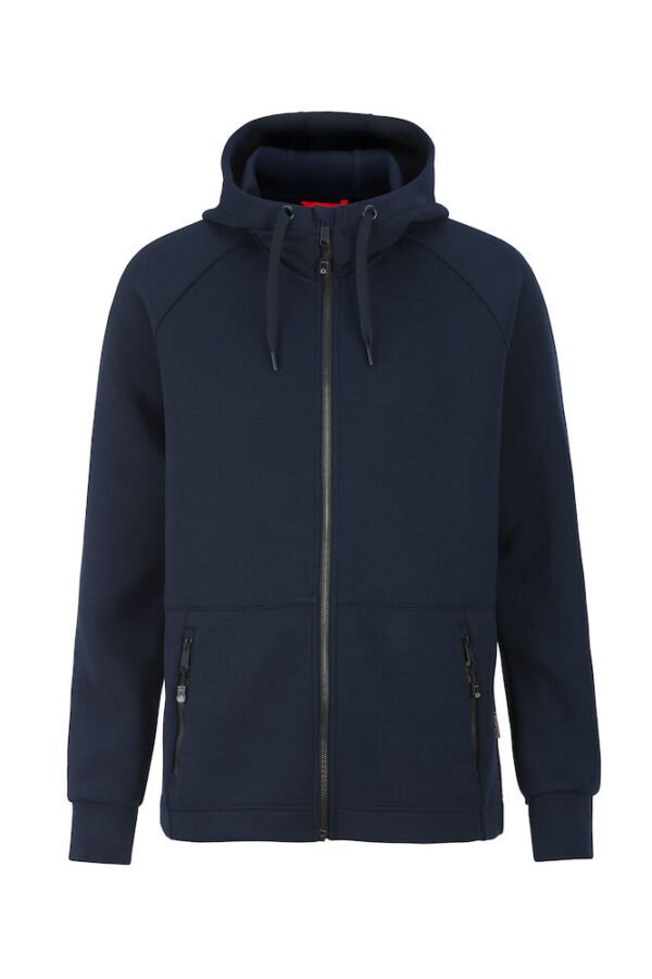 Hettegenser laget i et dobbeltstrikket materiale med ekstra stretch. Hettegenseren er laget av et blandemateriale med bl. annet sertifisert resirkulert polyester. Sydde mansjetter i nederkant og ermeavslutninger. Formsydd hette med doble sømmer og snøring. Glidelås som går opp i kragen og frontlommer med dekorative, sorte glidelåser. Hettegenseren har raglanermer og litt lengre rygg, noe som gir en svært god passform.