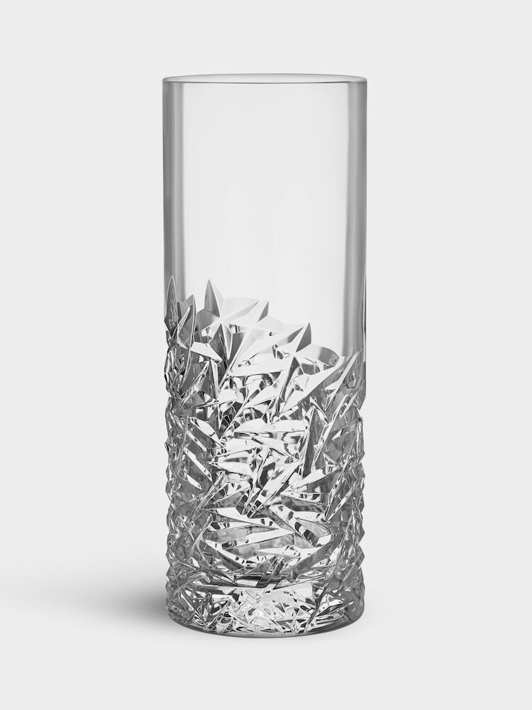 Carat-serien er basert på en moderne tolkning av tradisjonell glassliping som har gjort Orrefors verdenskjent. Den uregelmessige geometrien skaper refleksjoner av lys i krystallglasset. Den store sylindervasen har et uregelmessig mønster i bunnen som kontrast til det glatte glasset. Egnet for høyere snittblomster eller bare greiner. Designet av Lena Bergström.