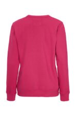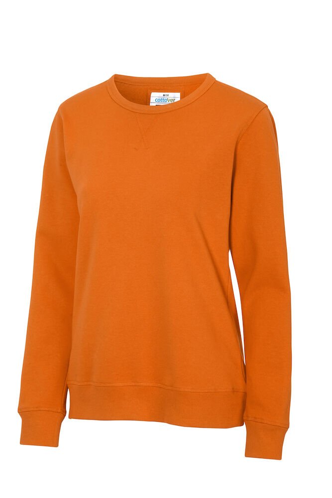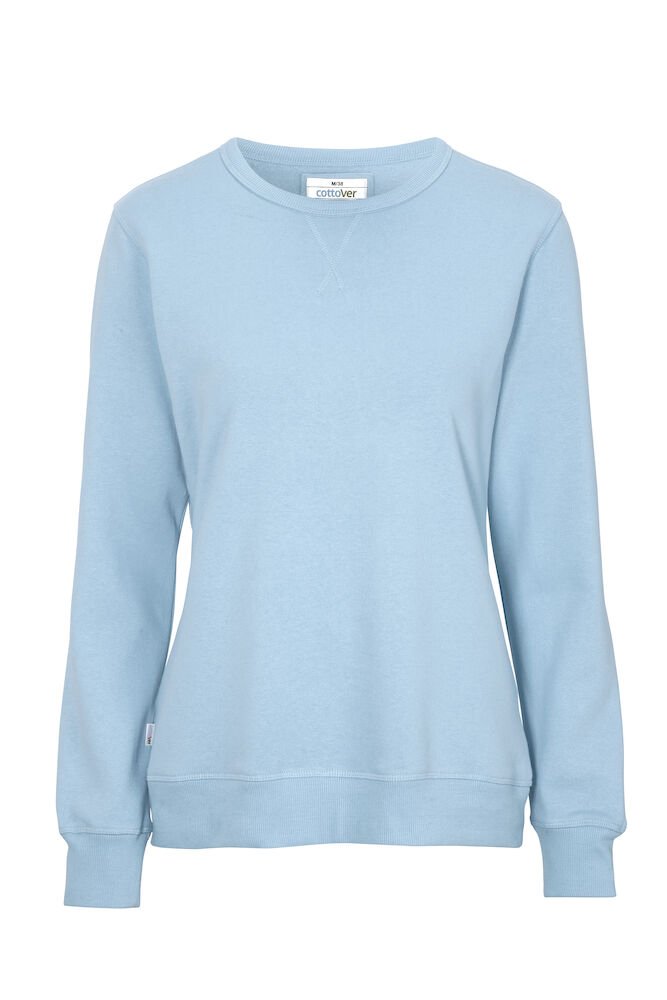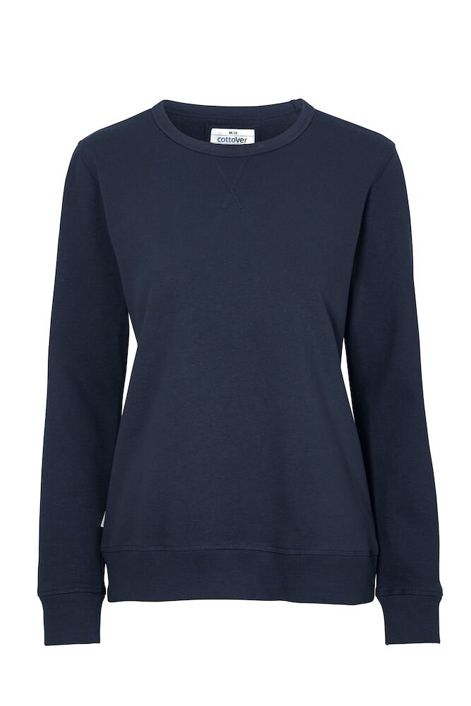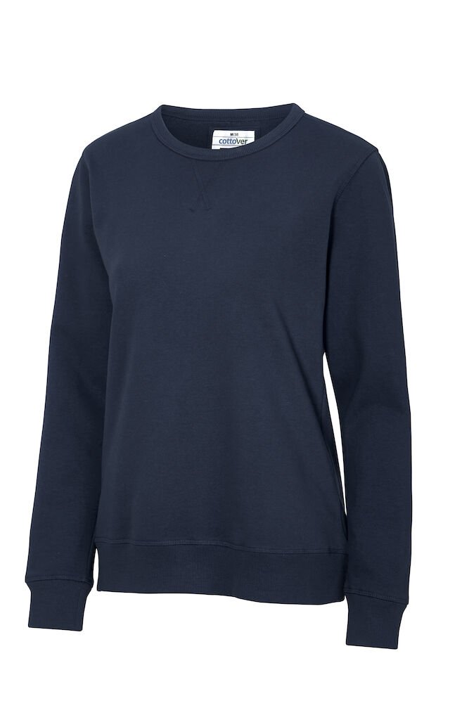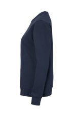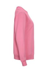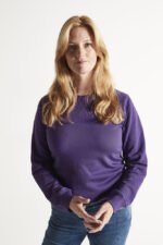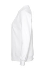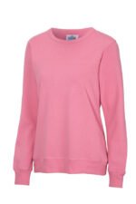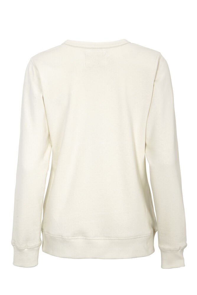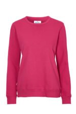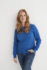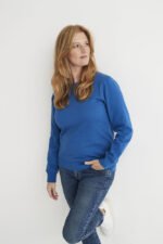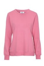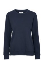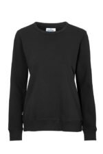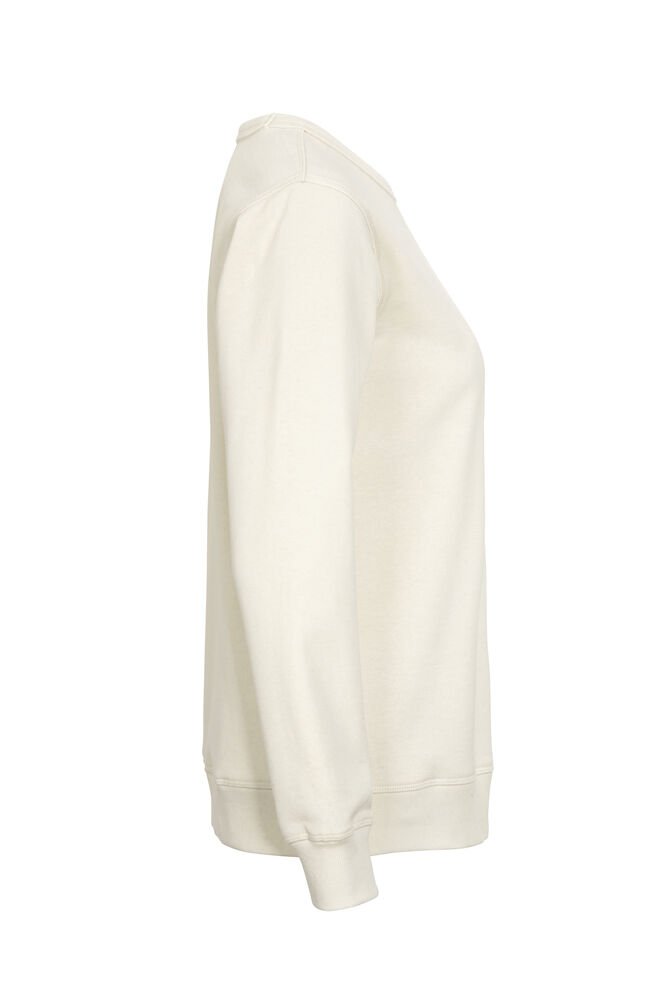 Rundhalset genser med børstet innside. Damemodell. 2×2 ribbestrikk rundt hals, ermeavslutning og nederkant. Dekorative ton-i-ton sømmer i overlock.