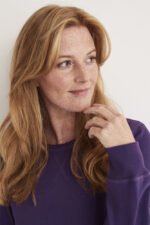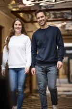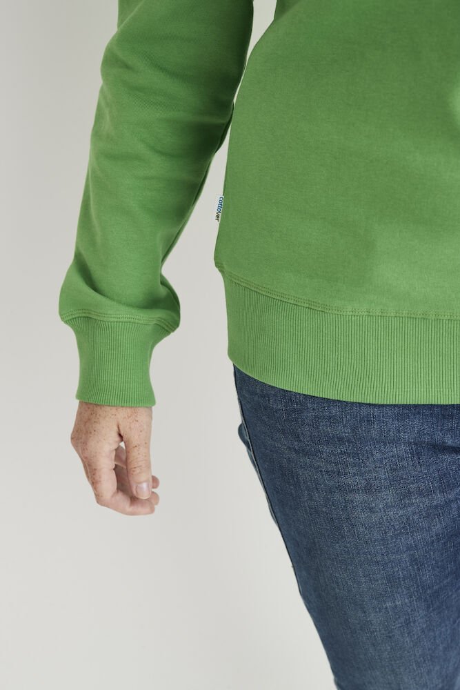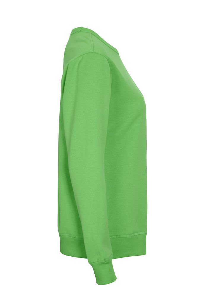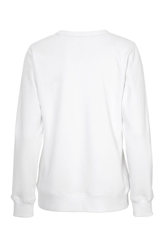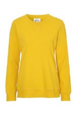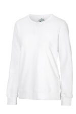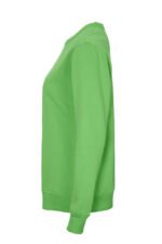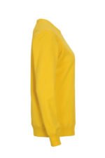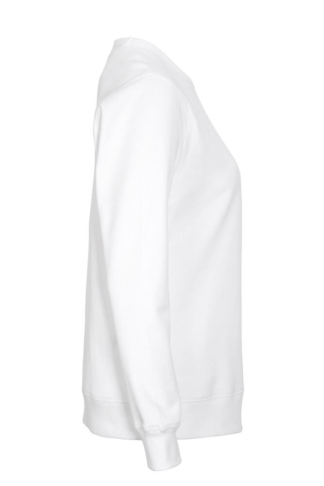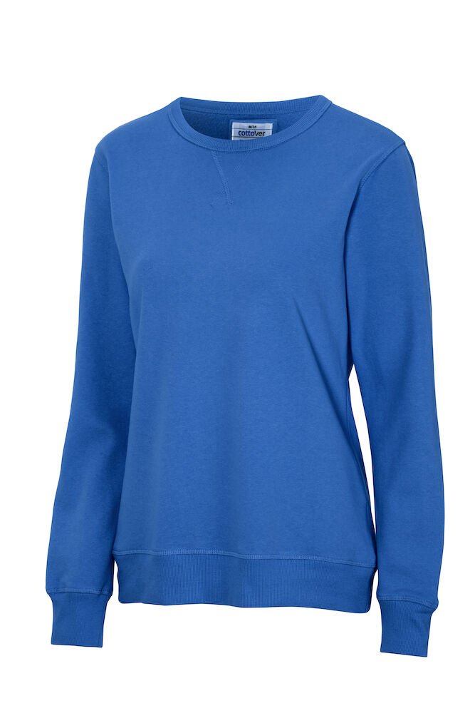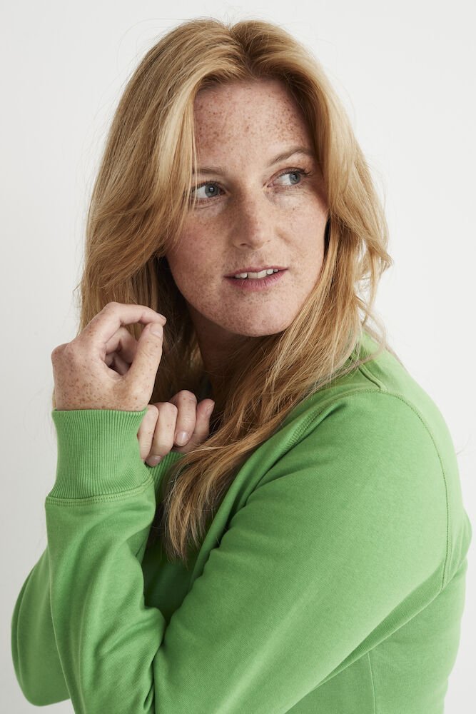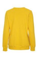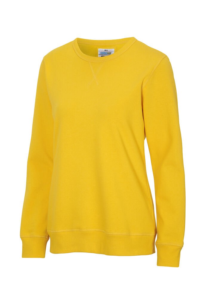 Rundhalset genser med børstet innside. Damemodell. 2×2 ribbestrikk rundt hals, ermeavslutning og nederkant. Dekorative ton-i-ton sømmer i overlock.