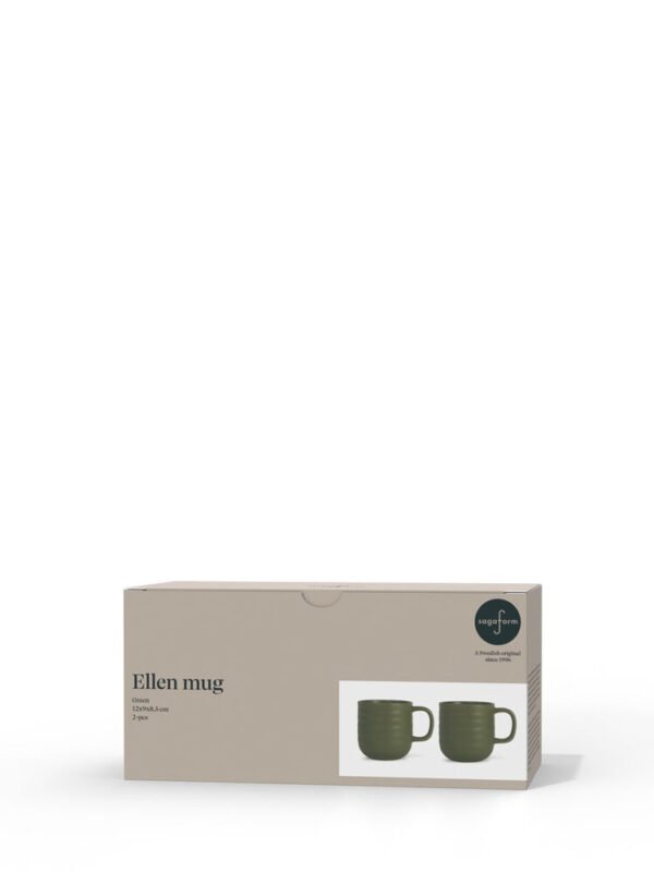 Kruset Ellen er perfekt for kaffe, te eller varm sjokolade. Designet er stilig med bølgende striper, eller frills som vi velger å kalle dem. Et krus som føles like kost som det er raust, og som raskt blir en favoritt. Ellen krus er laget av steintøy, og fargene er naturnære i grønt og off-white. Kommer i 2-pakning.