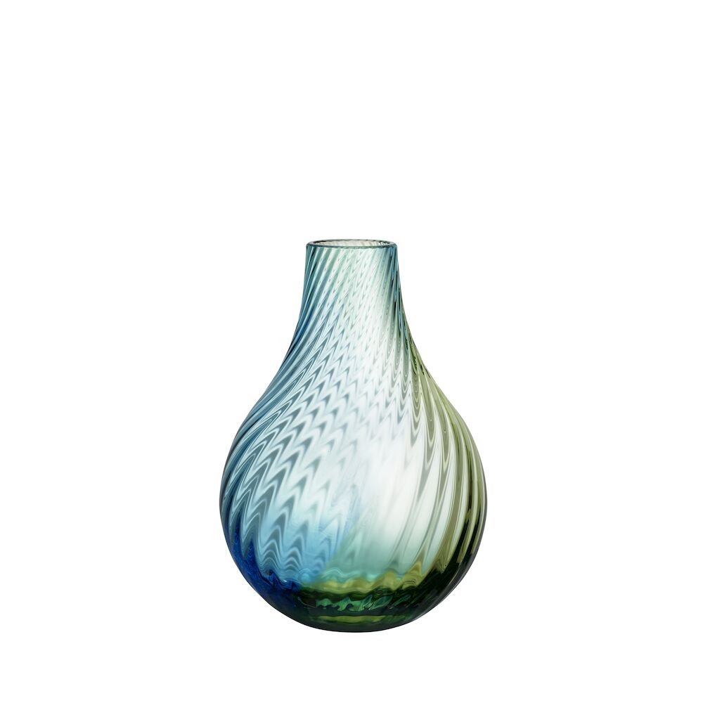 Håndblåst i Kosta. Disse dråpeformede vasene bruker et flerfarget underlag og optisk mønster. En teknikk som gir glasset ulik tykkelse under prosessen. Dette gir liv og et spesielt lysspill i glasset. Vasene minner om små smykker i nøye utvalgte fargesammensetninger.