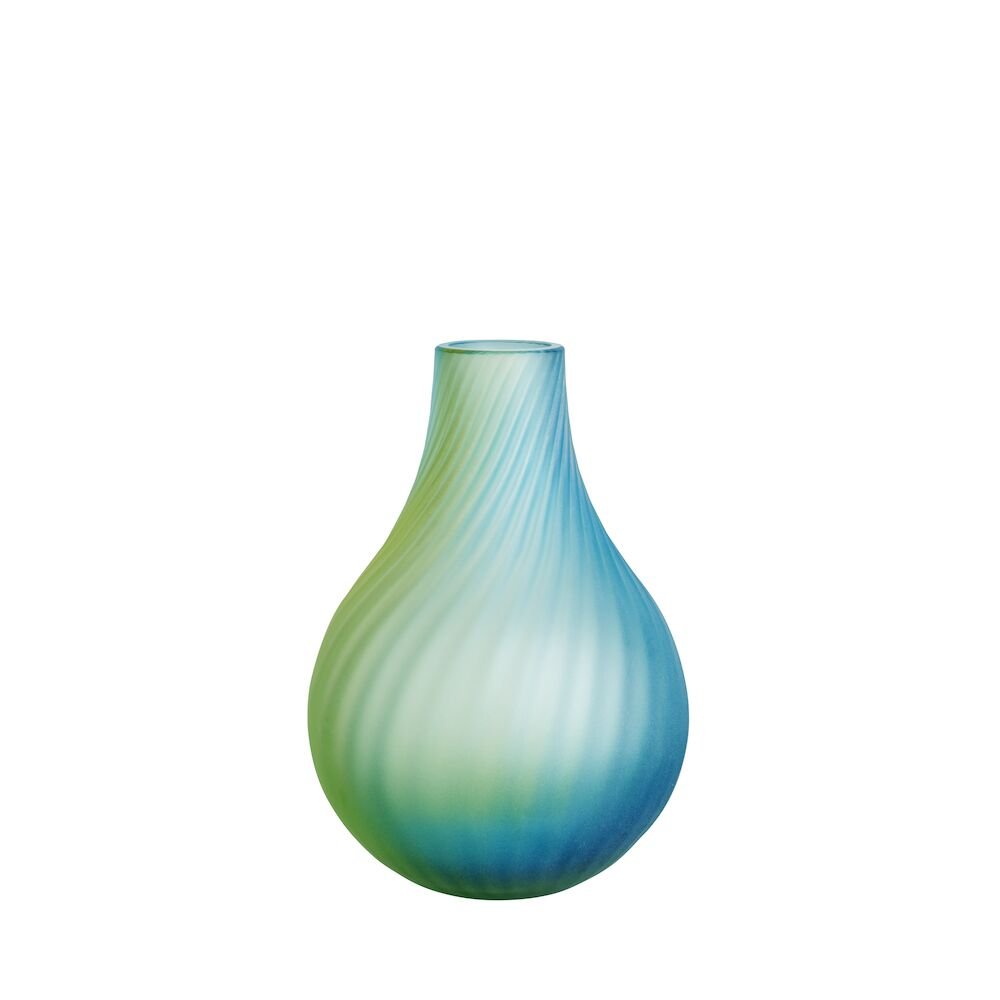 Håndblåst i Kosta. Disse dråpeformede vasene bruker et flerfarget underlag og optisk mønster. En teknikk som gir glasset ulik tykkelse under prosessen. Dette gir liv og et spesielt lysspill i glasset. Vasene minner om små smykker i nøye utvalgte fargesammensetninger.