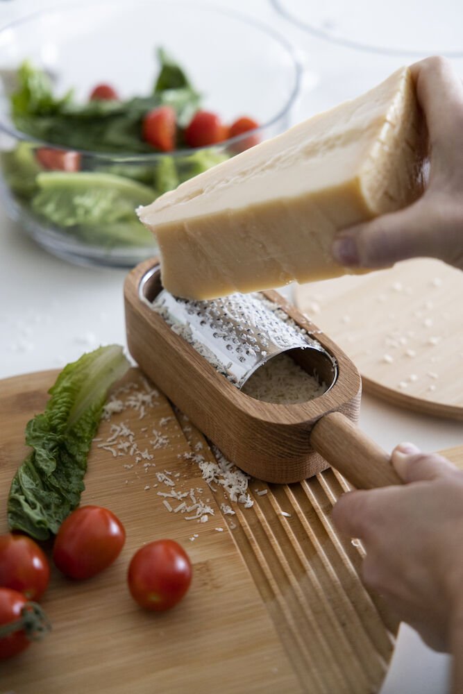 Smart parmesanriver! Kombinasjonen av eik og rustfritt stål gjør det lett å se at produktet er en del av den ikoniske serien Nature. Rivedelen kan enkelt løftes bort slik at du lett og stilig kan servere parmesanosten i eikebeholderen. Riverdelen i rustfritt stål kan vaskes i oppvaskmaskin, men ikke beholdere av eik. Husk å olje produktet med jevne mellomrom.
