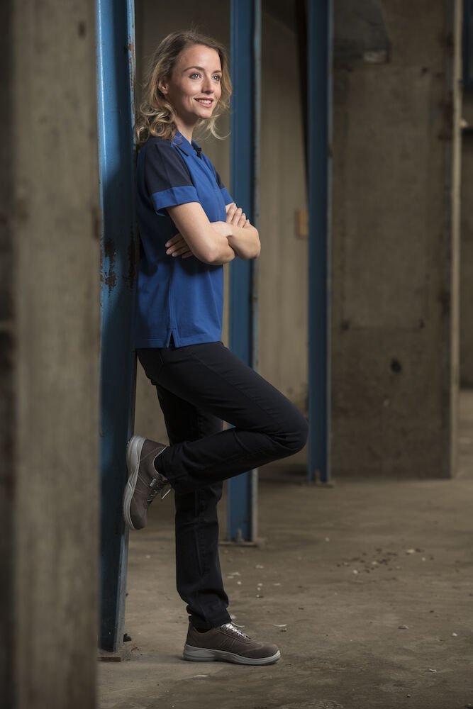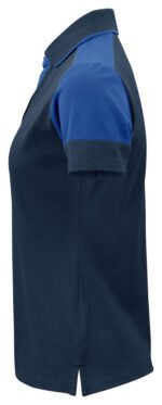 Tofarget pique uten knapper. Krage med kontrastfarge. Kontrastbånd i nakken og på sidespaltene. Tear-out label i nakken og en separat vevd størrelses-label. I den indre venstre sidesømmen er det satt inn en lomme med plass til en vaskechip. Testet for industriell vask i henhold til ISO 15797.