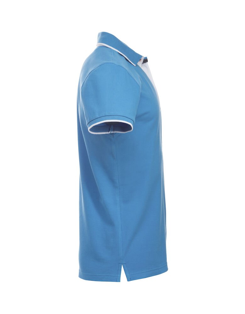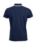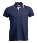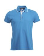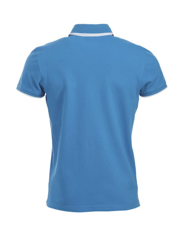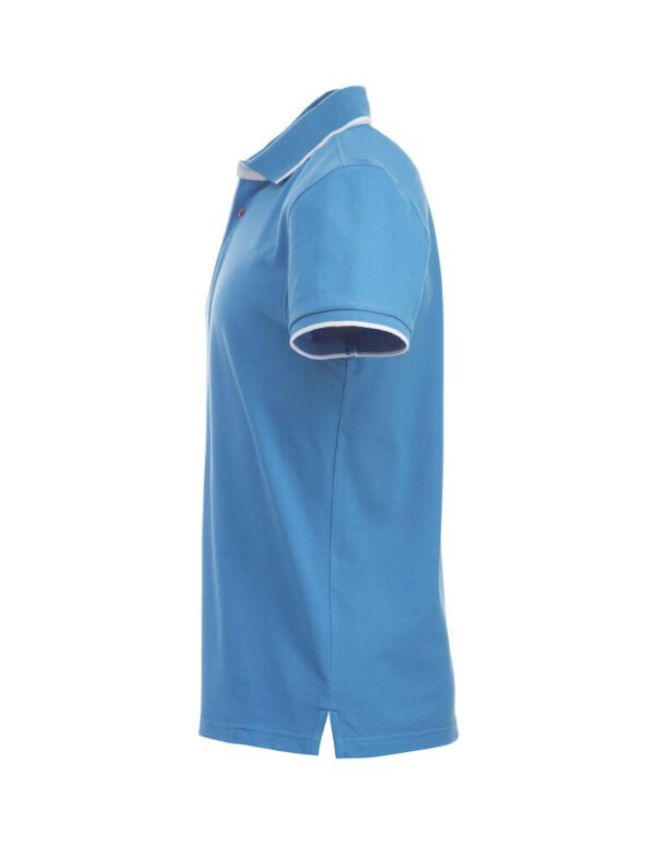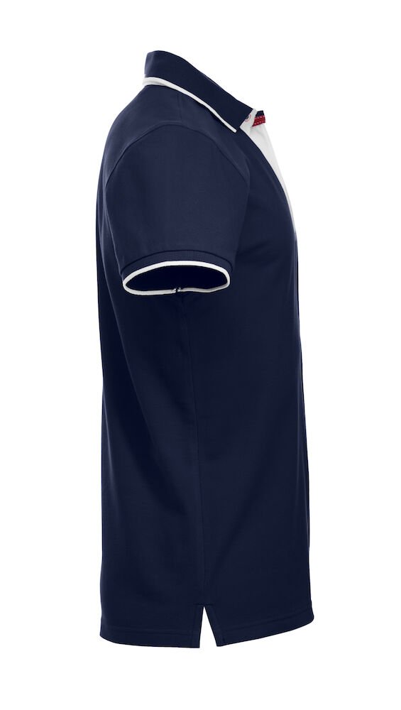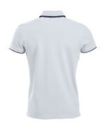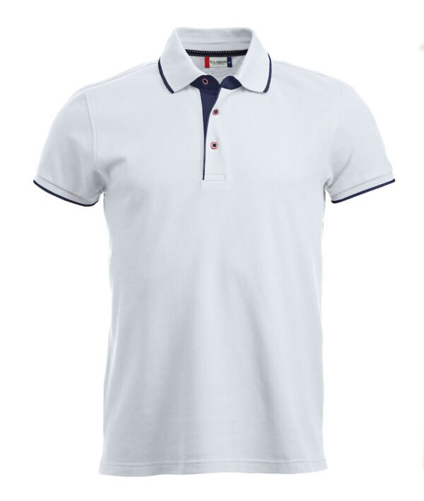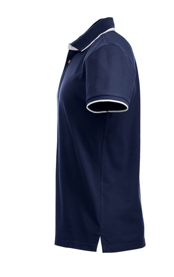 Pique med fargekontrast i knapper, nakkebånd, knappestolpe og splitt i sidene. Stående skjortekrage og knappestolpe med tre knapper på herremodellen og fem på dame. Kontraststripe på krage og armavslutning.