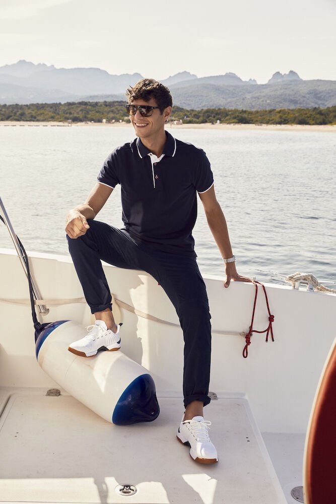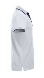 Pique med fargekontrast i knapper, nakkebånd, knappestolpe og splitt i sidene. Stående skjortekrage og knappestolpe med tre knapper på herremodellen og fem på dame. Kontraststripe på krage og ermavslutning.